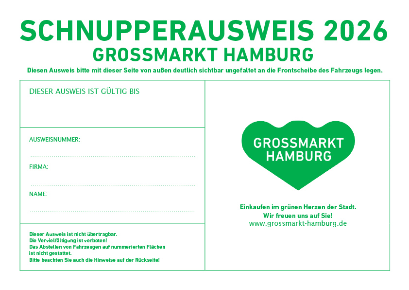 Der Schnupperausweis ist ein Marktausweis, für den keine Gebühr erhoben wird. Stellen Sie den Antrag für sich und bis zu zwei Mitarbeiter/innen und lernen Sie den Großmarkt kennen. Wie bei dem Dauerausweis auch berechtigt der Schnupperausweis zur Nutzung des gesamten Großmarktes: Obst, Gemüse, Blume.